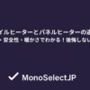パネルヒーターも輻射熱で暖める点は同じですが、多くは内部の電熱線を直接加熱する方式で、オイルヒーターよりも薄型・軽量なモデルが多いのが特徴です。